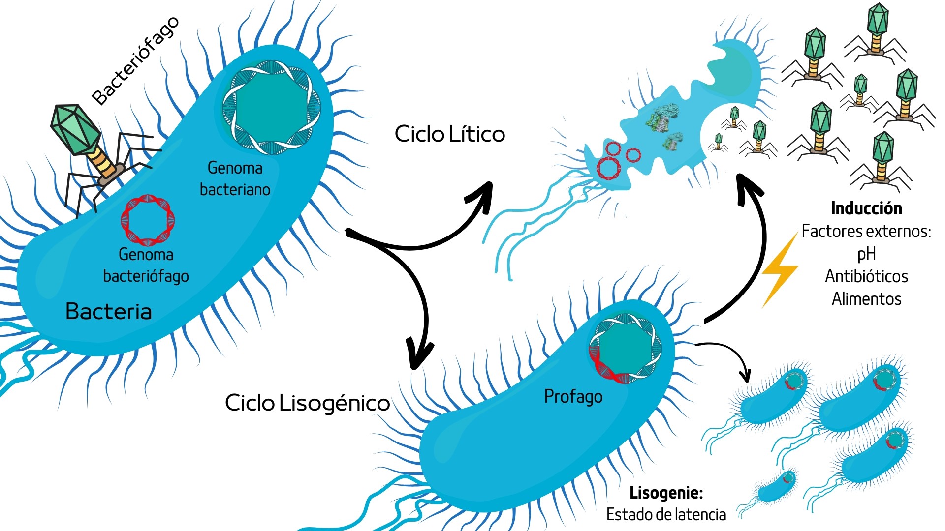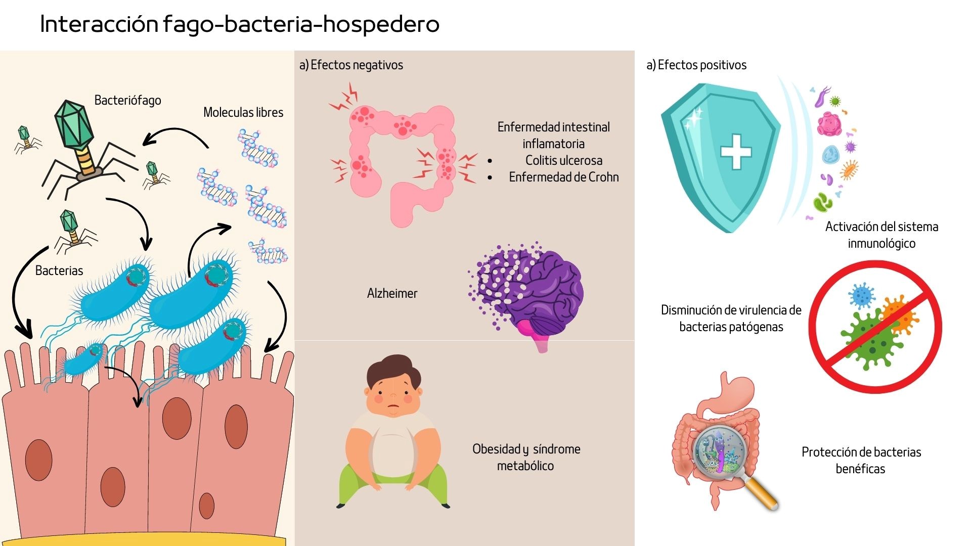 Por otro lado, los fagos también tienen un lado positivo, ya que pueden promover varios beneficios en el organismo. Estos virus pueden desarrollar y modular el sistema inmune debido a que pueden atravesar la barrera epitelial e interactuar directamente con dichas células, como el caso del fago T4, que activa de manera natural el sistema inmunológico en humanos (Dąbrowska et al., 2014). Incluso los fagos podrían ser esenciales desde edades tempranas porque pueden ser un factor determinante en el desarrollo del sistema inmunitario al interaccionar directamente con las mucosas desde la niñez (Virgin, 2014). Otros efectos benéficos incluyen que algunos fagos pueden favorecer la atenuación de cepas patógenas y reducir la virulencia y la capacidad de colonización de patógenos (Zhou et al., 2023). En otros casos, los fagos adheridos a las mucosas del intestino pueden formar un tipo de barrera antibacteriana manteniendo el equilibrio entre las poblaciones que colonizan el intestino (Hu et al., 2021).